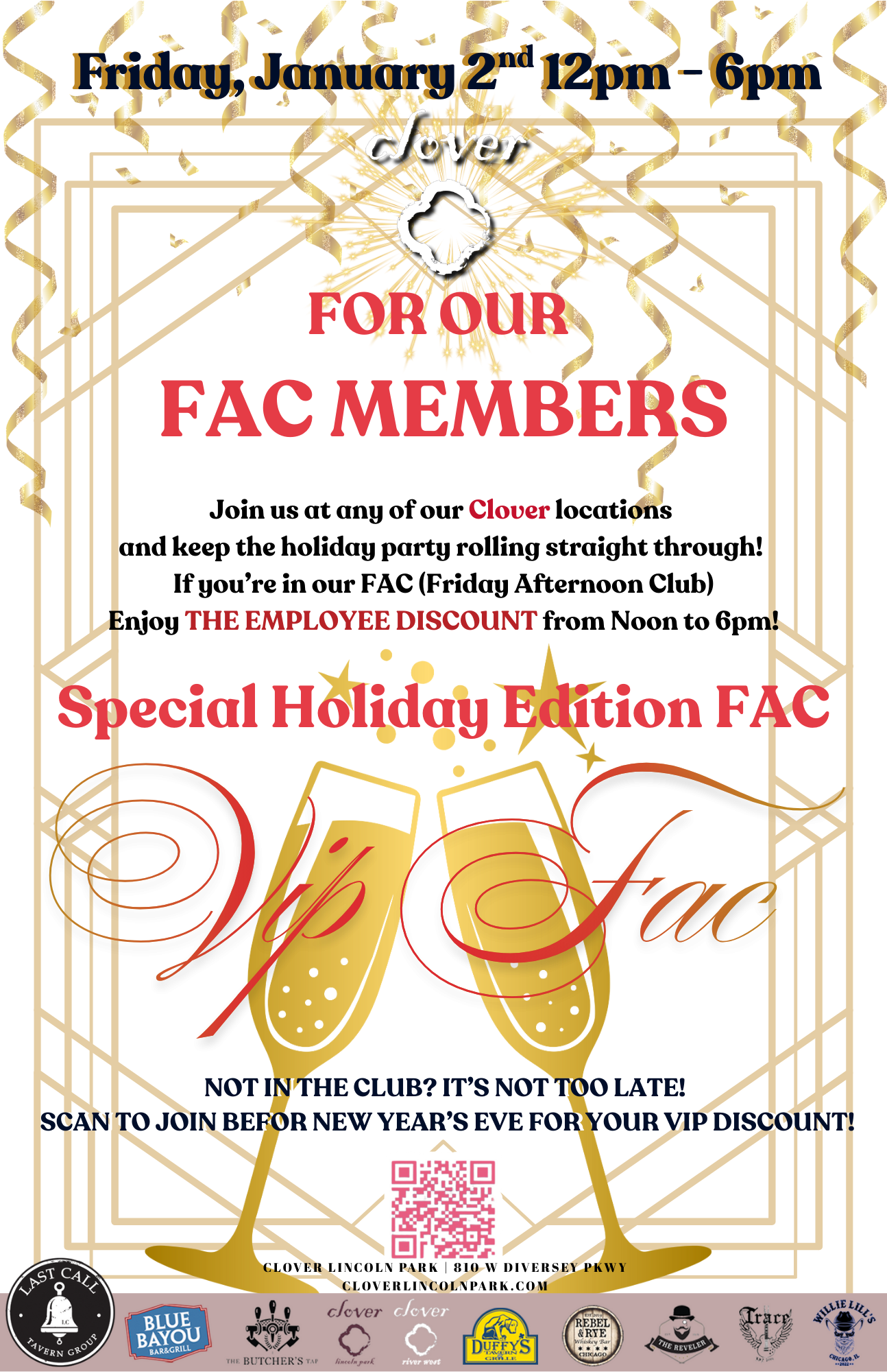 Start the New Year the right way with a VIP Holiday Edition of FAC at Clover Lincoln Park. FAC members are invited to enjoy exclusive employee discounts and keep the festive spirit alive well into January.
