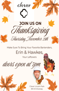 Join us for a cozy, post-feast night out at Clover Lincoln Park this Thanksgiving! After the family gatherings wind down, bring your favorite leftovers and settle in with your favorite bartenders, Erin & Hawkes, as we open our doors at 7PM for a relaxed, come-as-you-are holiday hang.